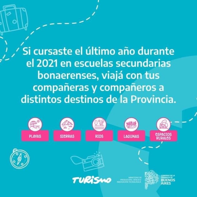 Los Viajes de Fin de Curso que financia la provincia de Buenos Aires apuntan a impulsar el Turismo, extender la temporada, reactivar la economía y potenciar la inclusión y la revinculación para 220.000 estudiantes de último año de las escuelas secundarias bonaerenses de gestión estatal y privada.