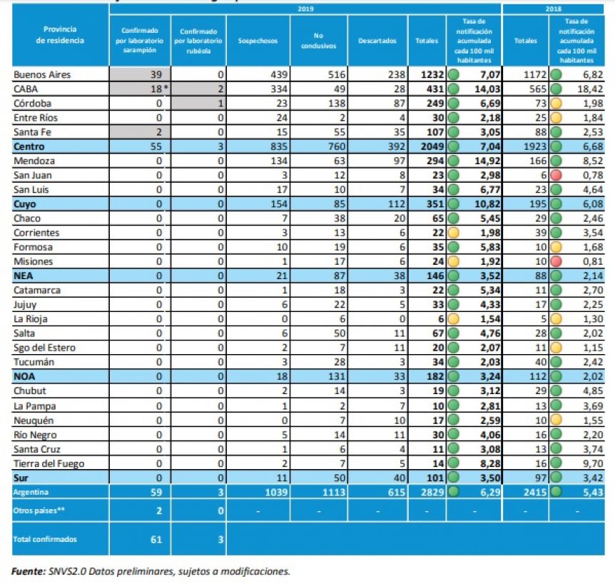 El último boletín de Salud, respecto al sarampión, develaron que hay 59 casos detectados en Argentina, 7 de ellos importados o relacionados a la importación y 52 no cuentan con antecedentes de viaje o vínculo hasta el momento con casos importados. De ese total, 38 corresponden a casos en territorio bonaerense.