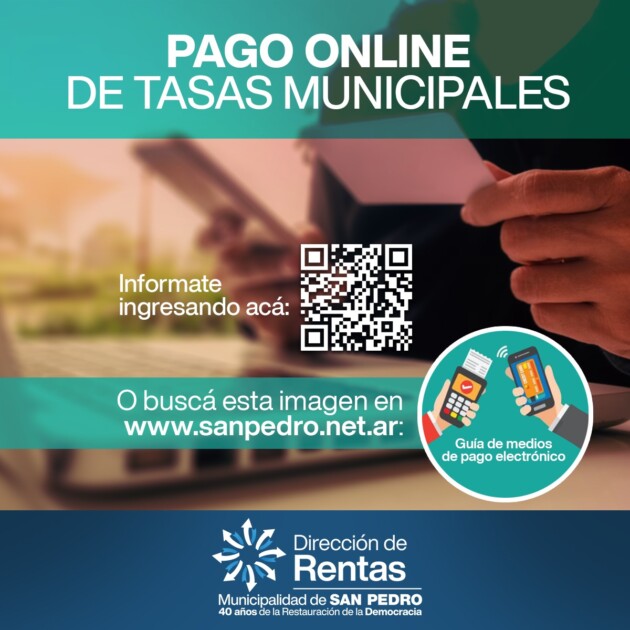 La Dirección de Rentas de la Municipalidad informó que se ha puesto en marcha el servicio de pagos en línea para las tasas municipales en San Pedro. Los contribuyentes ahora tienen la opción de realizar sus pagos de manera electrónica a través del sitio web oficial de la Municipalidad de San Pedro (https://sanpedro.net.ar) con el objetivo de brindar una alternativa para mantenerse al día con sus obligaciones.