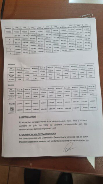 El acuerdo establece un aumento salarial acumulativo que regirá desde abril de 2025 hasta enero de 2026. Los salarios básicos aumentarán un 2% mensual durante los primeros cuatro meses y continuarán con incrementos progresivos, llegando al 1% mensual en los últimos meses del período. Además, se acordó el pago extraordinario de tres cuotas de $120.000.
