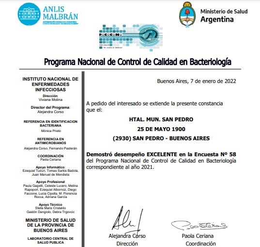 La constancia recibida indica que el Laboratorio del Hospital Municipal de San Pedro «demostró un desempeño excelente en la encuesta Nº58 del Programa Nacional de Control de Calidad Bacteriológica correspondiente al año 2021.