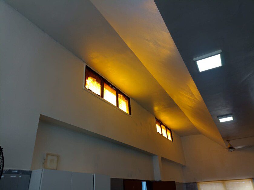 Entre los trabajos realizados se destaca la reparación de la losa, afectada por pérdidas de agua, así como el hidrolavado completo del sector. También se procedió al retiro de zócalos del techo y puertas de aglomerado en mal estado, y al sellado de las mesadas con fastix. Además, se trabajó en el sellado de grietas presentes en azulejos, techos y paredes utilizando poximix, y se aplicaron diferentes tipos de pintura: sintética en el techo, látex en las paredes y epoxi sobre los azulejos, lo que contribuye a una mayor durabilidad e higiene del ambiente.