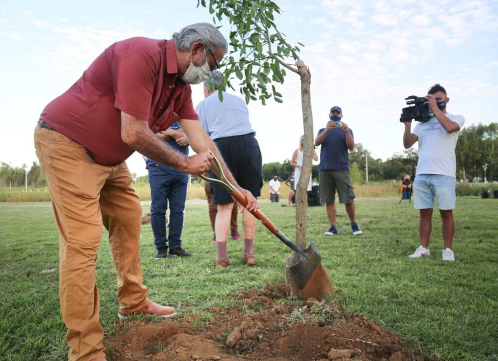 Junto a él, el artista sampedrino Jorge «Coqui» López que propuso la creación del Bosque en nuestra ciudad y el Intendente Salazar que respaldó esta iniciativa, estuvieron presentes en este acto.