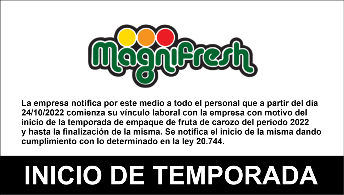 La empresa notifica por este medio a todo el personal que a partir del día 24/10/2022 comienza su vínculo laboral con la empresa con motivo del inicio de la temporada de empaque de fruta de carozo del período 2022 y hasta la finalización de la misma. Se notifica el inicio de la misma dando cumplimiento con lo determinado en la ley 20.744.