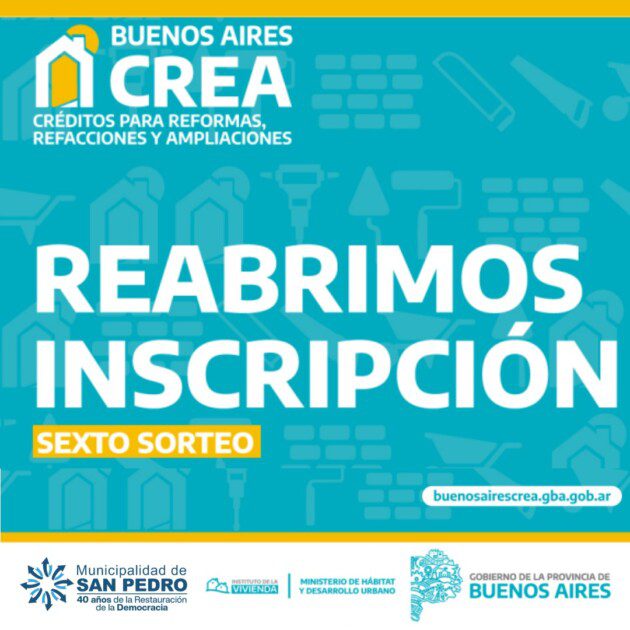 La Municipalidad de San Pedro informa que se encuentra abierta, hasta el martes 7 de noviembre, la sexta convocatoria del programa “Buenos Aires CREA” que lleva adelante el Gobierno de la Provincia de Buenos Aires destinado a quienes buscan realizar reformas, refacciones o ampliaciones en su hogar, brindando créditos accesibles para que más familias puedan vivir mejor.
