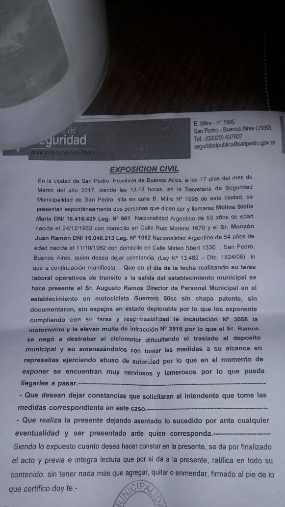 Puntualmente la Exposición Civil a la que tuvimos acceso, expresa: “En el día de la fecha, realizando su tarea laboral efectivos de tránsito a la salida del establecimiento municipal, se hace presente el Sr. Augusto Ramos Director de Personal Municipal en el establecimiento, en una motocicleta Guerrero 5 CC sin chapa patente, sin documentación, sin espejos, en estado deplorable. Por lo que los exponentes, cumpliendo con su tarea y responsabilidad, le incautaron la motocicleta N° 3058 y le elevan la multa de Infracción N° 3916. Por lo que el Sr. Ramos se negó a destrabar el ciclomotor dificultando su traslado al depósito municipal, y amenazándolos con tomar las medidas a su alcance como represalias, ejerciendo abuso de autoridad. Por lo que en el momento de exponer se encuentran muy nerviosos y temerosos a causa de lo que pueda llegar a pasarles.