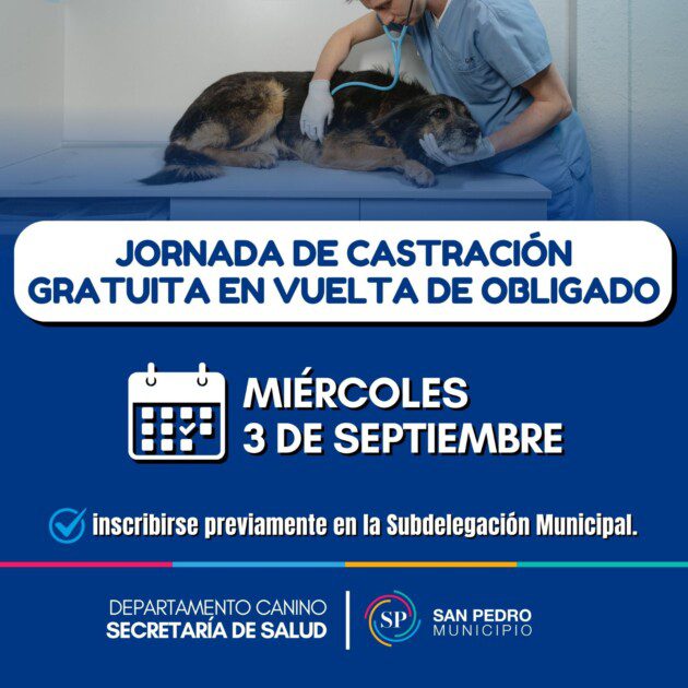 La Municipalidad de San Pedro, a través del Departamento Canino de la Secretaría de Salud, informó que el miércoles 3 de septiembre se realizará una nueva jornada de castración gratuita de perros y gatos en Vuelta de Obligado.