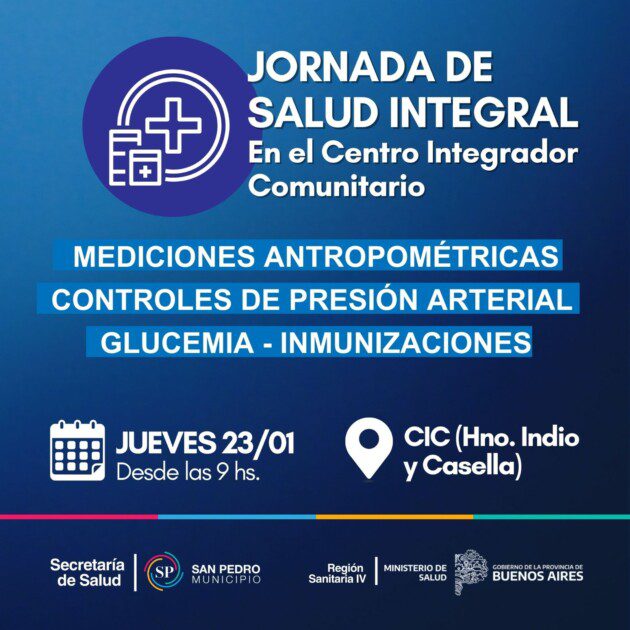 La Secretaría de Salud de la Municipalidad de San Pedro invita a participar de una Jornada de Salud Integral, que se realizará el jueves 23 de enero en el C.I.C ubicado en las calles Hermano Indio y Casella a partir de las 9:00 horas.