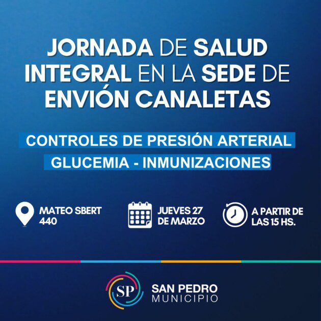 La Municipalidad de San Pedro, a través de las Secretarías de Salud y Desarrollo de la Comunidad, llevará a cabo una Jornada de Salud Integral el jueves 27 de marzo a las 15:00 en la sede de Envión Canaletas.