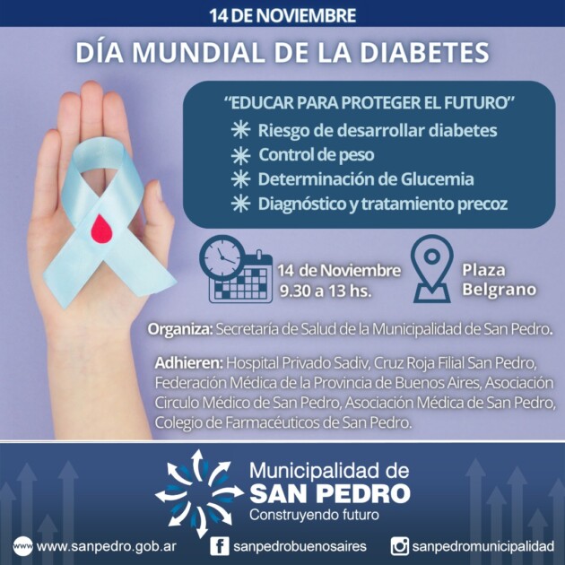 La Secretaría de Salud de la Municipalidad de San Pedro conjuntamente con el Hospital Privado Sadiv, Cruz Roja Filial San Pedro, Federación Médica de la Provincia de Buenos Aires, Asociación Circulo Médico de San Pedro, Asociación Médica de San Pedro y el Colegio de Farmacéuticos de San Pedro preparan una jornada educativa y de control en el marco del Día Mundial de la Diabetes.