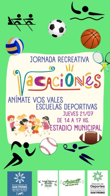 La Municipalidad de San Pedro, a través de la Dirección de Deportes informa que el jueves 21 de julio de 14 a 17 hs. se desarrollará en el Estadio Municipal una jornada recreativa de Vacaciones junto a los integrantes de los programas Animate Vos Vales y Escuelas Deportivas.