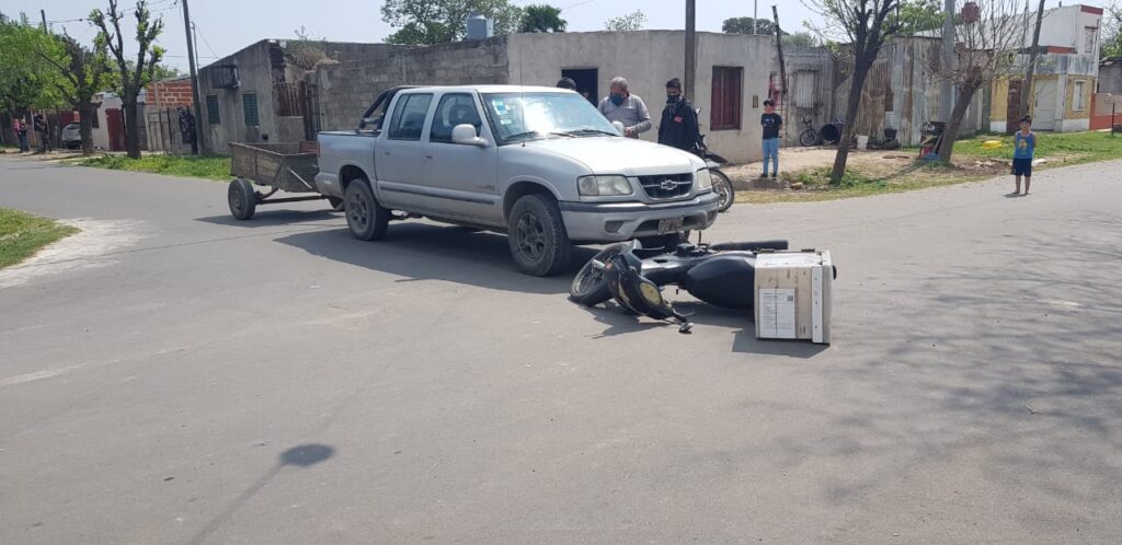 Este jueves alrededor de las 12 hs en calle Quiroga y Las Provincia ocurrió un siniestro vial donde un joven que se desempeña como mensajero circulaba en una motocicleta tipo 110 cc que impacta contra una camioneta Chevrolet s10 color gris en el que circulaba un hombre mayor de edad.