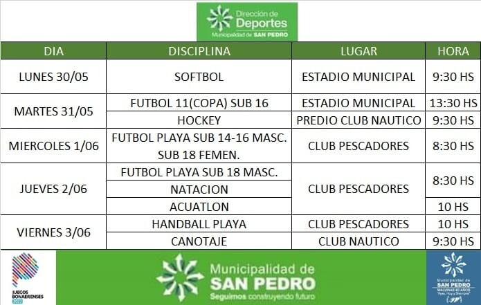 Continúa desarrollándose la etapa local de los Juegos Bonaerenses 2022, esta semana habrá actividades en el Estadio Municipal, Club Pescadores y Club Náutico con las disciplinas Softbol, Fútbol, Hockey, Fútbol Playa, Natación, Acuatlón, Handball Playa y Canotaje.