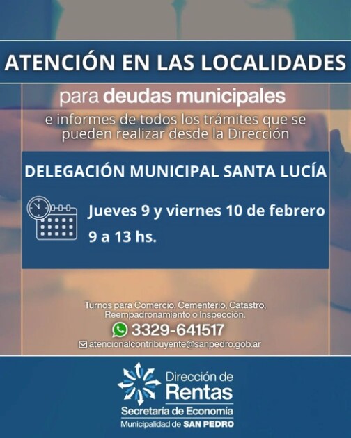 Este jueves 9 de febrero, representantes de la Dirección de Rentas de la Municipalidad de San Pedro brindarán atención al público en la Delegación Municipal de Santa Lucía en el horario de 9.00 a 13.00. La actividad se repetirá el día viernes 10 de febrero en el mismo horario.