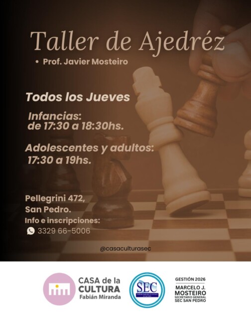 La Casa de la Cultura “Fabián Miranda” anunció la apertura de inscripciones para un nuevo Taller de Ajedrez, una propuesta pensada para todas las edades que busca fomentar el desarrollo intelectual a través del juego.