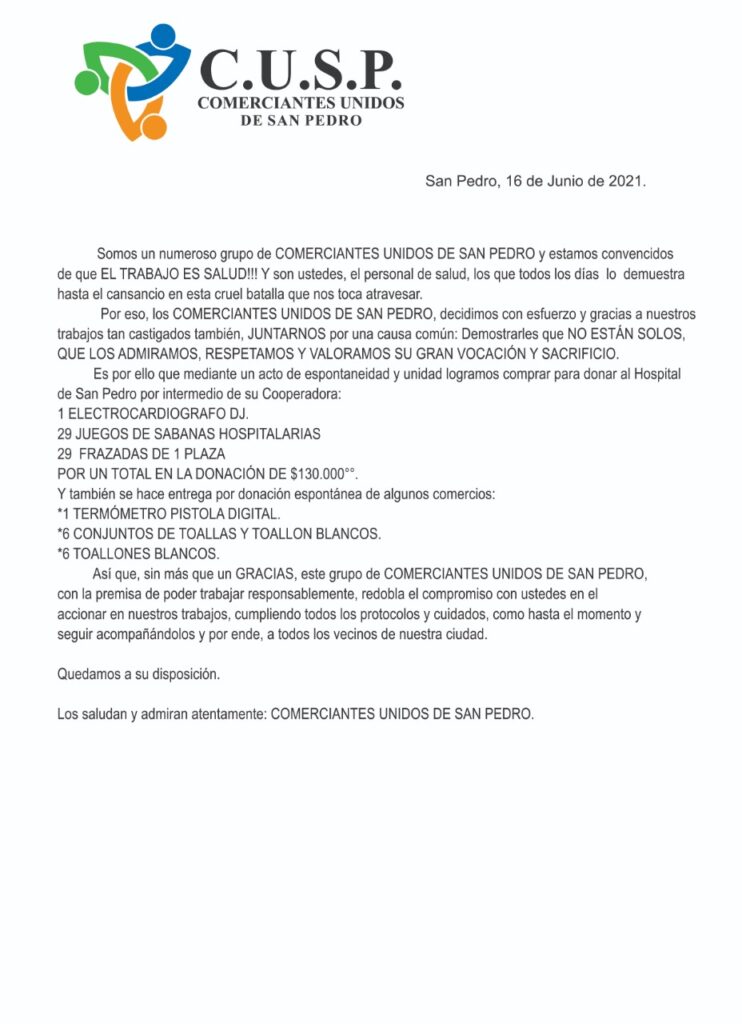 En la mañana de hoy en el Hospital de nuestra ciudad se realizo la donación por parte de un grupo de vecinos auto convocados que se denominan Comerciantes Unidos de San Pedro.