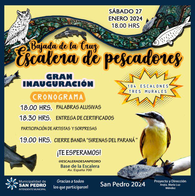 Desde la Municipalidad de San Pedro, los invitamos al acto de inauguración de la escalera de Pescadores que se desarrollará el sábado 27 de enero desde las 18 hs. en la base de la escalera.