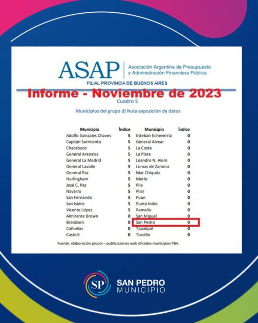 La Municipalidad de San Pedro ha sido destacada en el informe del Índice de Transparencia de la Asociación Argentina de Presupuesto y Administración Financiera Pública (ASAP), ubicándose en el grupo de «cumplimiento estricto» con el puntaje ideal de 100 puntos. Este reconocimiento, correspondiente al relevamiento del tercer trimestre de 2024, refleja el compromiso del municipio con la transparencia en la gestión de sus cuentas públicas y el acceso ciudadano a la información fiscal y presupuestaria.