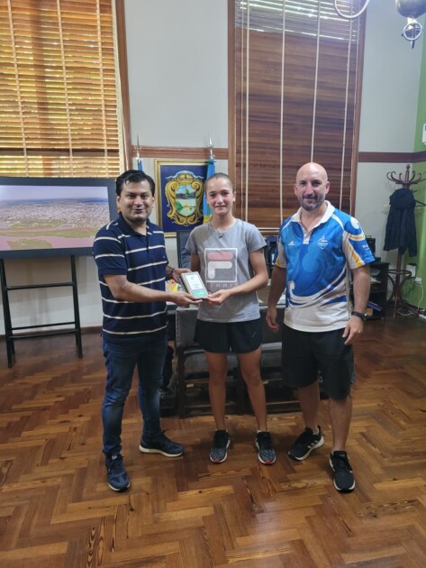 La joven tenista Candela Vázquez fue recibida por el Intendente Dr. Ramón Salazar en el despacho oficial junto al secretario de Coordinación Hernán Contreras y el director de Deportes Mariano Arnal donde se le brindó un reconocimiento por su gran desarrollo como tenista.