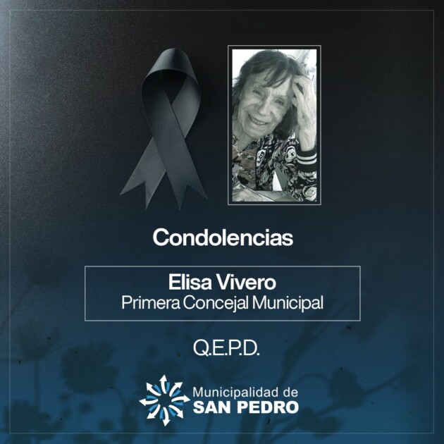 La Municipalidad de San Pedro recuerda a la ex concejala municipal Elisa Ángela Vivero y hace públicas sus condolencias a familiares, amigos, compañeros y compañeras en el Honorable Concejo Deliberante, durante su desempeño.