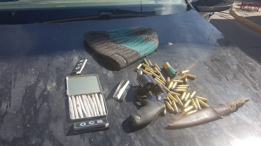Durante mas de una hora los oficiales de la local requisaron la camioneta encontrando en su interior un revolver calibre 38, mas de 30 municiones y un acrtucho de escopeta, un cuchillo, cigarrillos de marihuana y una capucha.