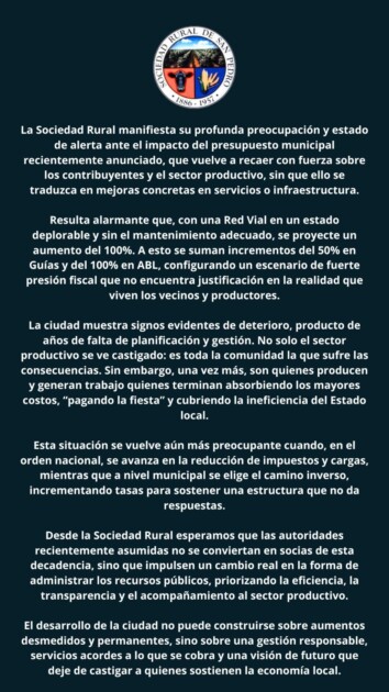 La Sociedad Rural manifestó su profunda preocupación y estado de alerta ante el impacto del presupuesto municipal recientemente anunciado, al considerar que vuelve a recaer con fuerza sobre los contribuyentes y el sector productivo, sin que ello se traduzca en mejoras concretas en servicios o infraestructura.