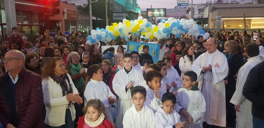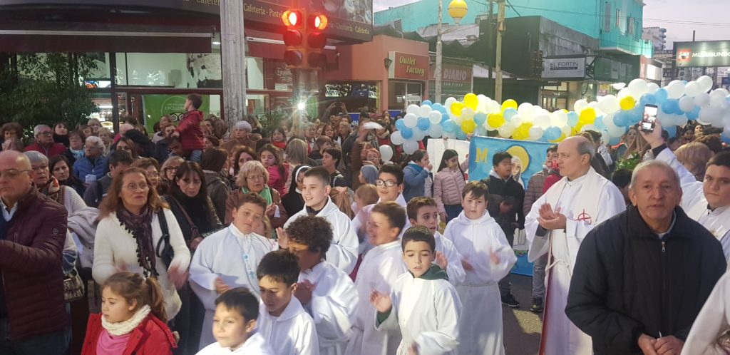 Una multitud acompañó en procesión a la Virgen desde la intersección de Mitre y Tres de Febrero hasta el templo Nuestra Señora del Socorro donde se realizó una misa en su honor con un Rosario iluminado alrededor de la plaza Constitución.