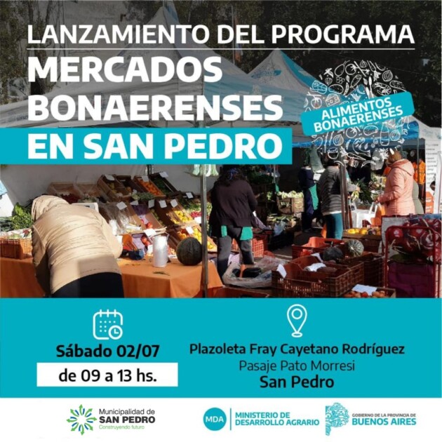 La Municipalidad de San Pedro junto al Ministerio de Desarrollo Agrario de la Provincia de Buenos Aires lanzarán este sábado 2 de julio el programa “Mercados Bonaerenses” en la ciudad de San Pedro.