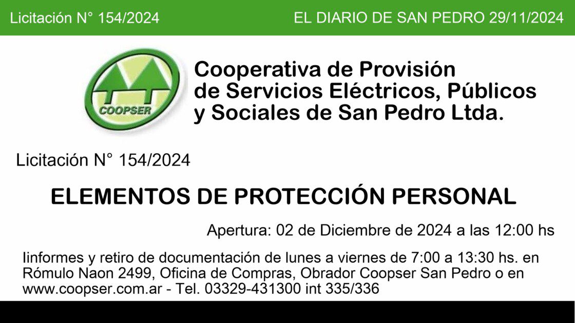 Informes y retiro de documentación de lunes a viernes de 7:00 a 13:30 hs. en Rómulo Naon 2499, Oficina de Compras, Obrador Coopser San Pedro o en www.coopser.com.ar. Tel 03329-431300 int 335/336