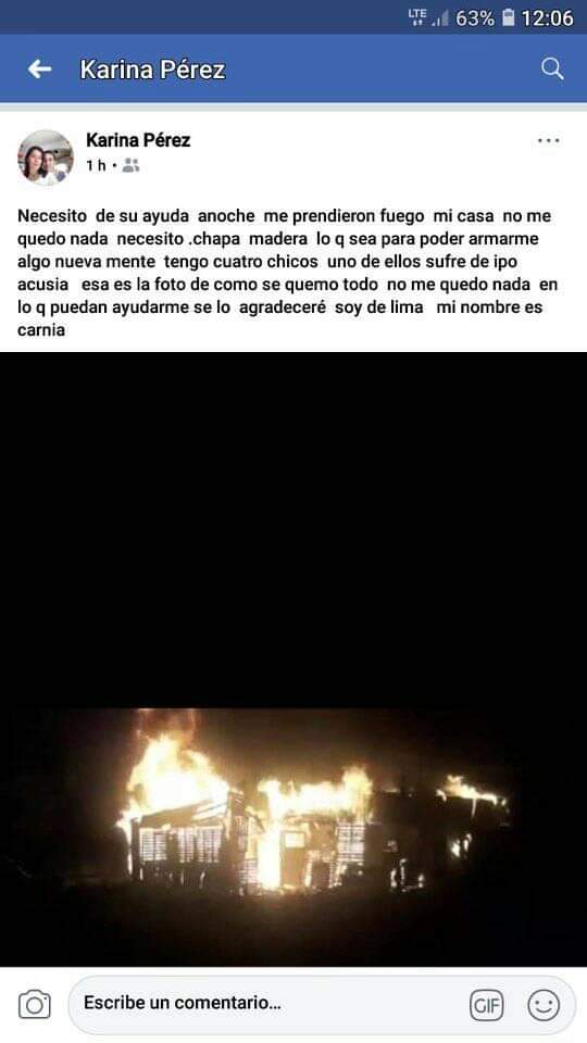 Minutos antes de medianoche, una familia de Lima sufrió un gran incendio en su vivienda de Barrio Cementerio. Lo perdieron todo, solicitan donaciones.