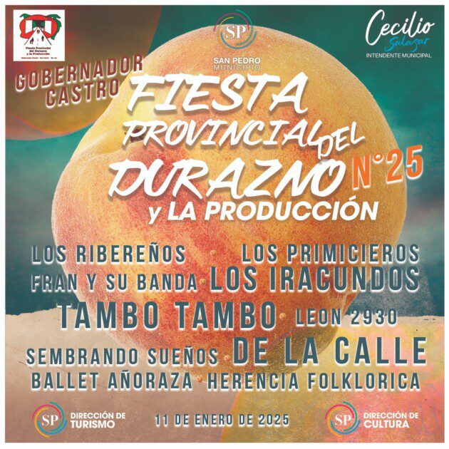 Avanzan los preparativos para la 25° edición de la Fiesta Provincial del Durazno y la Producción, que se celebrará el sábado 11 de enero en el campo de deportes del Club Agricultores de Gobernador Castro. Este año, la celebración ofrecerá una propuesta artística que incluirá espectáculos musicales, danzas tradicionales y shows en vivo, con la participación de Sol Altolaguirre, Leo Maes, Añoranza Ballet, Herencia Folklórica, Sembrando Sueños, Los Rivereños, Los Primicieros, Fran y su Banda, Iracundos, Tambo Tambo, y el grupo De la Calle estará a cargo del cierre.