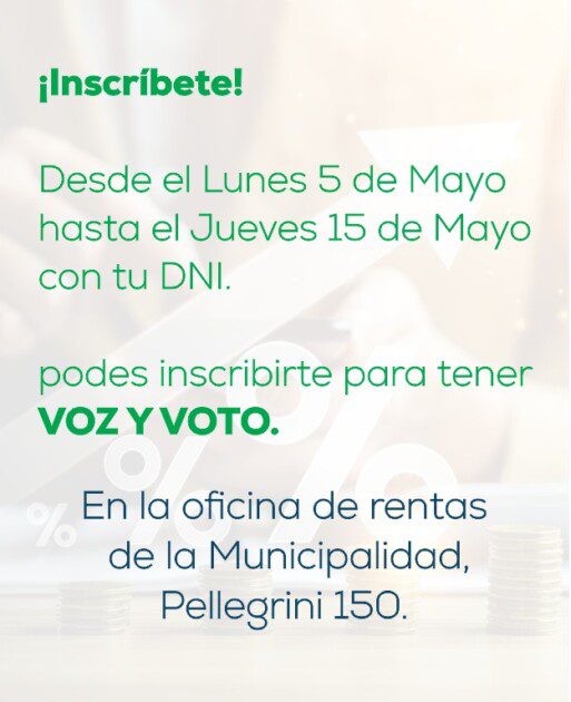 La inscripción estará habilitada desde el lunes 5 hasta el jueves 15 de mayo, y se realizará en la oficina de Rentas de la Municipalidad, ubicada en Pellegrini 150. Los interesados deberán presentarse con su DNI para formalizar el trámite.