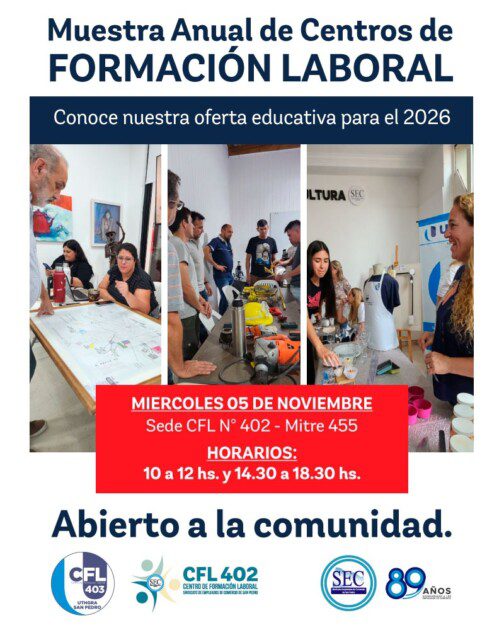 El Sindicato de Empleados de Comercio organiza una muestra especial que reunirá a los Centros de Formación Laboral (CFL) N° 402 y N° 403, instituciones que a lo largo de todo el año promovieron capacitación, desarrollo profesional y oportunidades laborales para la comunidad sampedrina.