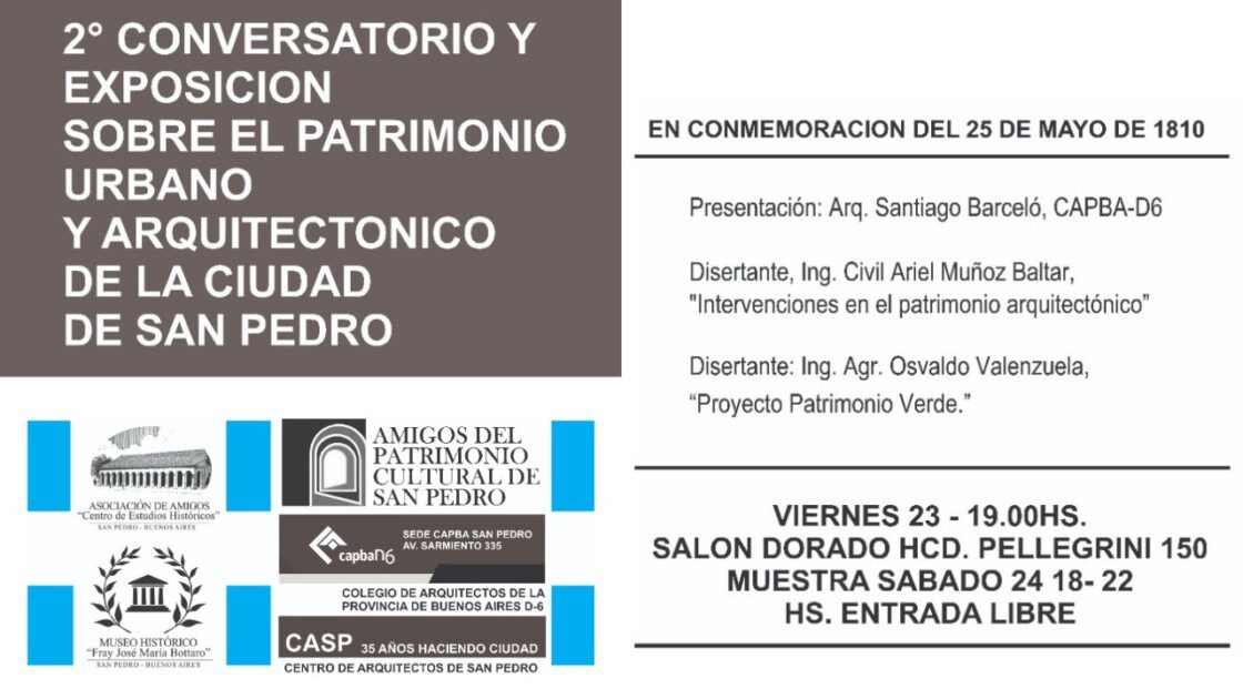 El evento, de acceso libre y gratuito, cuenta con el auspicio del Colegio de Arquitectos de la Provincia de Buenos Aires, Distrito 6, y la colaboración de instituciones locales como el Centro de Arquitectos de San Pedro, Amigos del Patrimonio Cultural de San Pedro y Proyecto Patrimonio Verde (Asociación Amigos del Centro de Estudios Históricos de San Pedro).