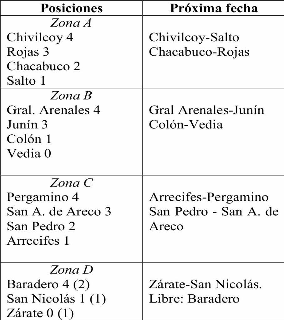 La segunda fecha se jugó parcial, ya que Vedia- Junín reprogramaron para este jueves a las 20:30 su cotejo. Pergamino le ganó a S. A. de Areco y es puntero del grupo, mientras que, en otra zona Baradero es líder luego de empatar con San Nicolás