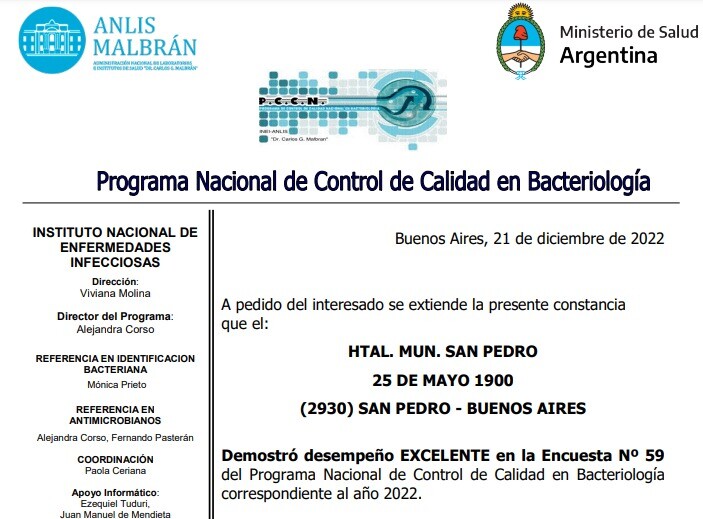 El Laboratorio del Hospital Dr. Emilio Ruffa, dirigido por el bioquímico Adrián Spoti, recibió en los últimos días los certificados que avalan el «desempeño EXCELENTE en la Encuesta Nº 59 del Programa Nacional de Control de Calidad en Bacteriología correspondiente al año 2022».
