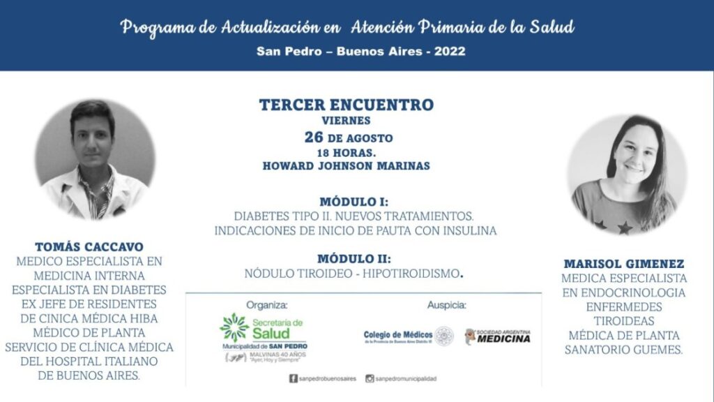 Luego de las dos primeras experiencias, sumamente productivas para todos los participantes, en esta oportunidad se presentarán los módulos «Diabetes Tipo II, nuevos tratamientos y pautas con insulina» y «nódulo tiroideo e hipotiroidismo», con la participación del Dr. Tomás Caccavo especialista en medicina interna y diabetes del Hospital Italiano de Buenos Aires y Marisol Giménez especialista en endocrinología y enfermedades tiroideas del Sanatorio Güemes.