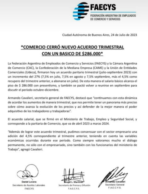 La Cámara Argentina de Comercio y Servicios (CAC), la Confederación Argentina de la Mediana Empresa (CAME), la Unión de Entidades Comerciales Argentinas (UDECA) y la Federación Argentina de Empleados de Comercio y Servicios (FAECyS) firmaron un acuerdo paritario trimestral (julio-septiembre 2023) con un incremento del 27% (7,5% desde julio, 7,5% desde agosto y 7,5% desde septiembre, más el 4.5% como recupero del trimestre anterior a abonarse en julio.