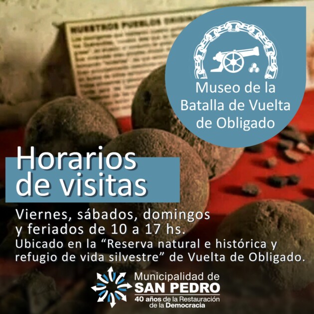 Museo de la Batalla de Vuelta de Obligado: Viernes, sábados, domingos y feriados de 10 a 17 hs. en la Reserva Natural e Histórica y Refugio de Vida Silvestre de Vuelta de Obligado.