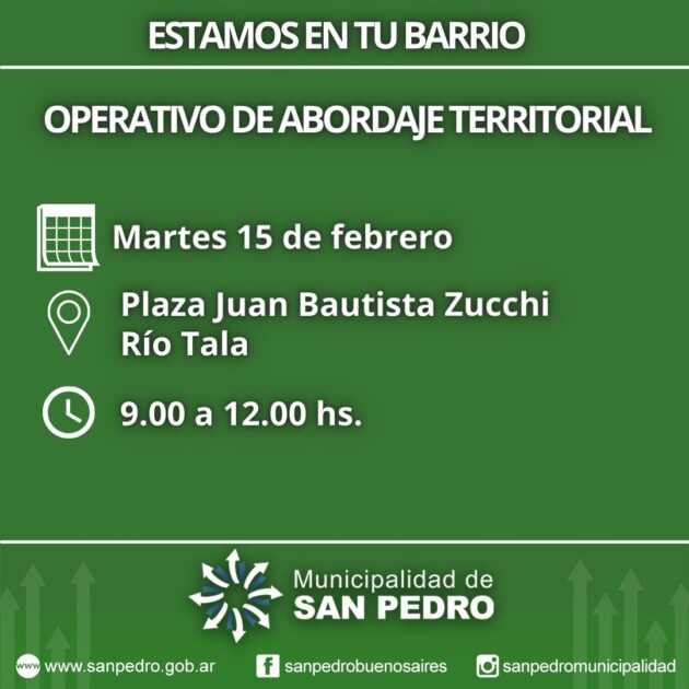 El Gobierno Municipal oficializó, a través de una conferencia de prensa encabezada por el Secretario de Gobierno Pablo Vlaeminck junto a los secretarios de Salud Pablo Pichioni, Políticas de Género, Mujeres y Diversidad Laura Monfasani, Desarrollo Económico Martín Baraybar, Turismo y Cultura Marcela Cuñer, Desarrollo Humano Walter Sánchez y la directora de Comisiones de Fomento Inés Mario, la puesta en marcha del operativo de abordaje territorial que se desarrollará en barrios y localidades del partido comenzando el martes 15 de febrero de 9 a 12 en la plaza Juan Bautista Zucchi de Río Tala.
