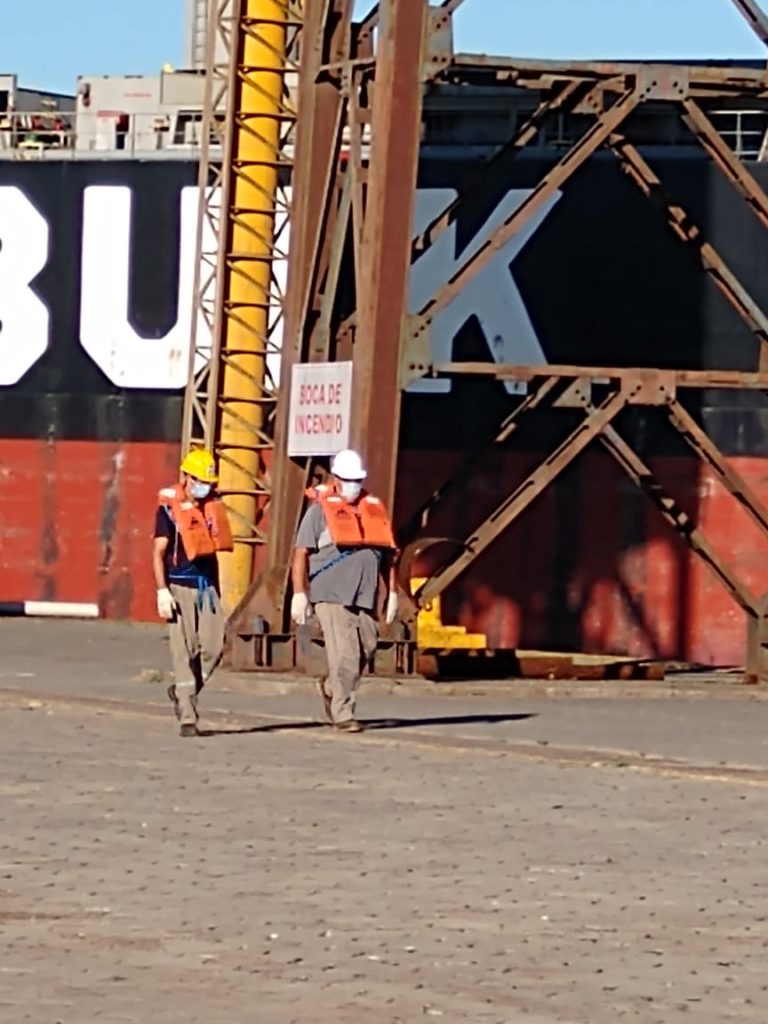 Tras el amarre del buque, personal de la Prefectura Naval Argentina, con todas las protecciones del caso, cumple con la inspección y control de la tripulación, para luego habilitar el ingreso al mismo, del personal mínimo e indispensable para la carga.