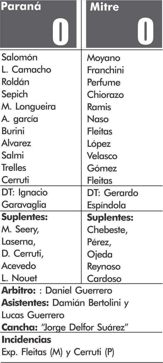 En el “Jorge D. Suárez” de Paraná Fútbol Club se jugó el clásico local. Si bien estuvieron lejos de la punta en el torneo clausura, el partido era clave para ambos, la clasificación a octavos de final. Paraná y Mitre más allá de los puntos siempre tiene su atractivo y por ello hubo una buena cantidad de público. Sin embargo, no brindaron un buen espectáculo y el empate clasificó a octavos de final a Mitre luego de la igualdad entre Agricultores y San Roque.