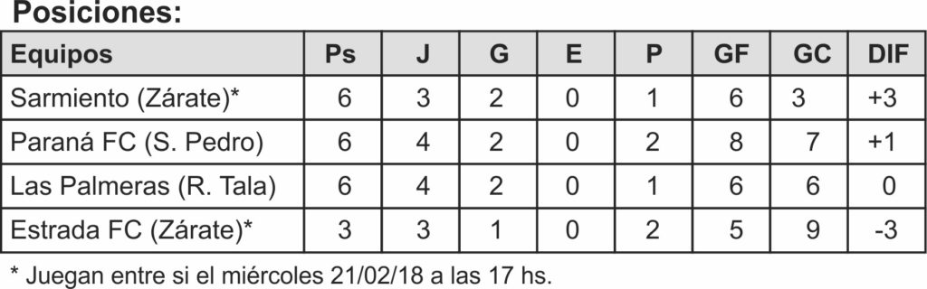 Paraná tenía la necesidad de sumar luego de la derrota ante Sarmiento y el propio Las Palmeras en la fecha inicial, aunque sufrió para lograr el objetivo, ya que ganó en un partido muy parejo y desde el minuto inicial del complemento estaba abajo en el marcador (gol de Berrini), pero logró la igualdad a través de Espíndola los 10m y a 5m del final tras un corner (que fue muy protestado por la visita, ya que entendían que era saque de arco) apareció la cabeza de Arrieta y poner otra vez en carrera al equipo de Sandro Velasco. El otro partido de la zona, Sarmiento y Estrada FC, ambos zarateños, no se jugó ya que nunca llegó la terna de árbitros de la Liga de Escobar. El mismo pasó para este martes.