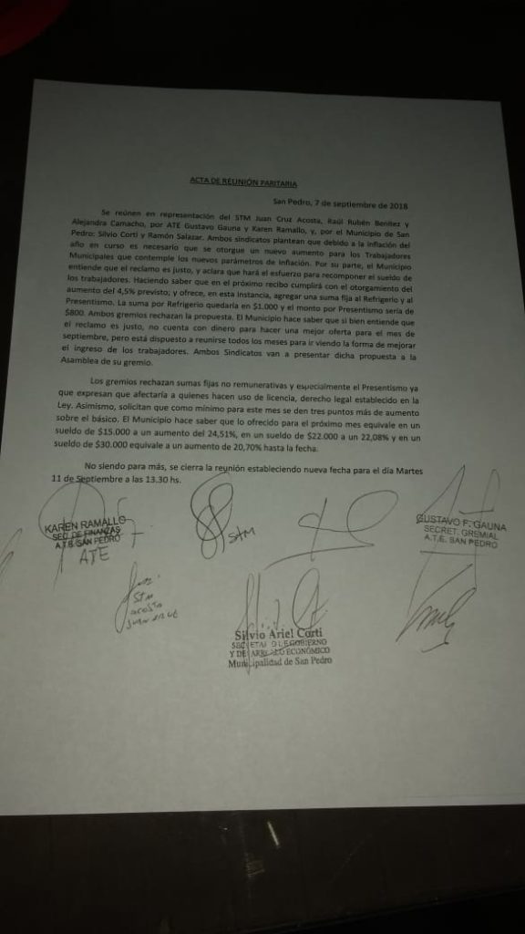 Se reúnen en representación del STM Juan Cruz Acosta, Raúl Rubén Benítez y Alejandra Camacho, por ATE Gustavo Gauna y Karen Ramallo, y, por el Municipio de San Pedro: Silvio Corti y Ramón Salazar. Ambos sindicatos plantean que debido a la Inflación del año en curso es necesario que se otorgue un nuevo aumento para los Trabajadores Municipales que contemple los nuevos parámetros de inflación. Por su parte, el Municipio entiende que el reclamo es justo, y aclara que hará el esfuerzo para recomponer el sueldo de los trabajadores. Haciendo saber que en el próximo recibo cumplirá con el otorgamiento del aumento del 4,5% previsto; y ofrece, en esta instancia, agregar una suma fija al Refrigerio y al Presentismo. La suma por Refrigerio quedaría en $1.000 y el monto por Presentismo sería de $800. Ambos gremios rechazan la propuesta. El Municipio hace saber que si bien entiende que el reclamo es justo, no cuenta con dinero para hacer una mejor oferta para el mes de septiembre, pero está dispuesto a reunirse todos los meses para Ir viendo la forma de mejorar el ingreso de los trabajadores. Ambos Sindicatos van a presentar dicha propuesta a la Asamblea de su gremio.