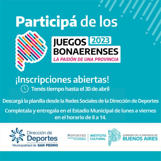 La Dirección de Deportes de la Municipalidad de San Pedro informa que se encuentran disponibles de forma virtual las planillas para las inscripciones a las diferentes disciplinas que participarán de la edición 32º del torneo deportivo y cultural más importante de la Provincia.
