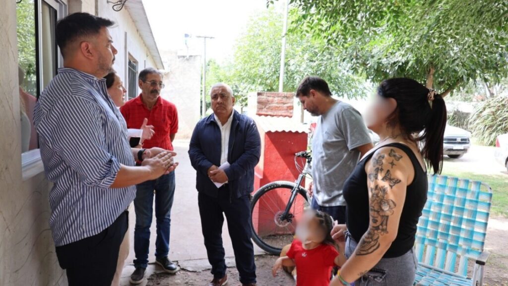 El intendente Cecilio Salazar, junto al secretario de Desarrollo de la Comunidad, Walter Sánchez; el secretario de Obras y Servicios Públicos, Arq. Mariano Brañas; el director de Asistencia Directa, José Franchini, y el delegado de Santa Lucía, Sergio Barrios, visitaron una vivienda en Pueblo Doyle, la primera beneficiaria del programa.