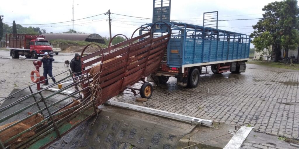 Desde el mediodía, con la autorización correspondiente de la Prefectura San Pedro, en el espigón N°2 de la dársena de cabotaje, los camiones ingresan a esperar las barcazas que trasladan la hacienda proveniente de la zona de islas hacia campos de San Pedro y alrededores.