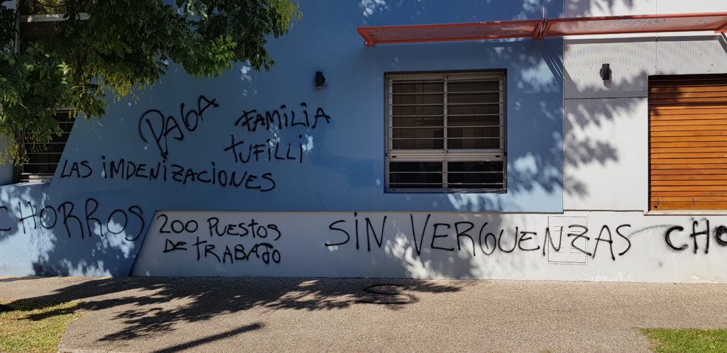 Las paredes y las calles fueron pintadas con aerosol “CUMPLÍ LA PALABRA”, “LADRONES”, “MARTIN LARA PAGA”, “MARTIN LARA CHORRO”.