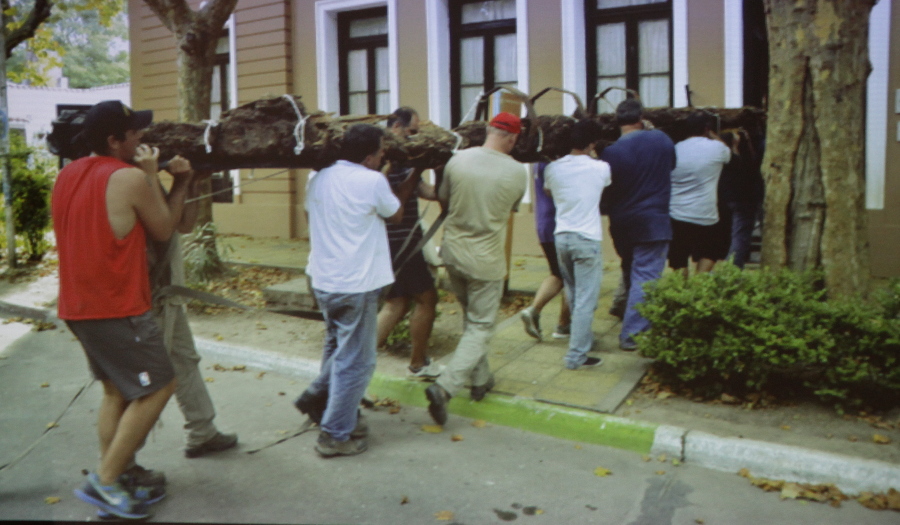 Una vez posicionado y asegurado, se procedió a mover el conjunto para sacarlo del lugar donde estaba y poder, así, subirlo al transporte que lo esperaba para ser trasladado hasta el Museo Paleontológico de San Pedro, debido a que en esos días (enero de este año), el Museo de la Batalla estaba amenazado por la inundación que afectó a toda la zona.