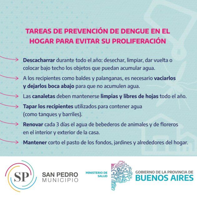 La Municipalidad de San Pedro, a través de la Secretaría de Salud, recuerda la importancia de reforzar las medidas de prevención del dengue, especialmente en días de lluvia, cuando la acumulación de agua favorece la reproducción del mosquito Aedes Aegypti, transmisor de esta enfermedad.